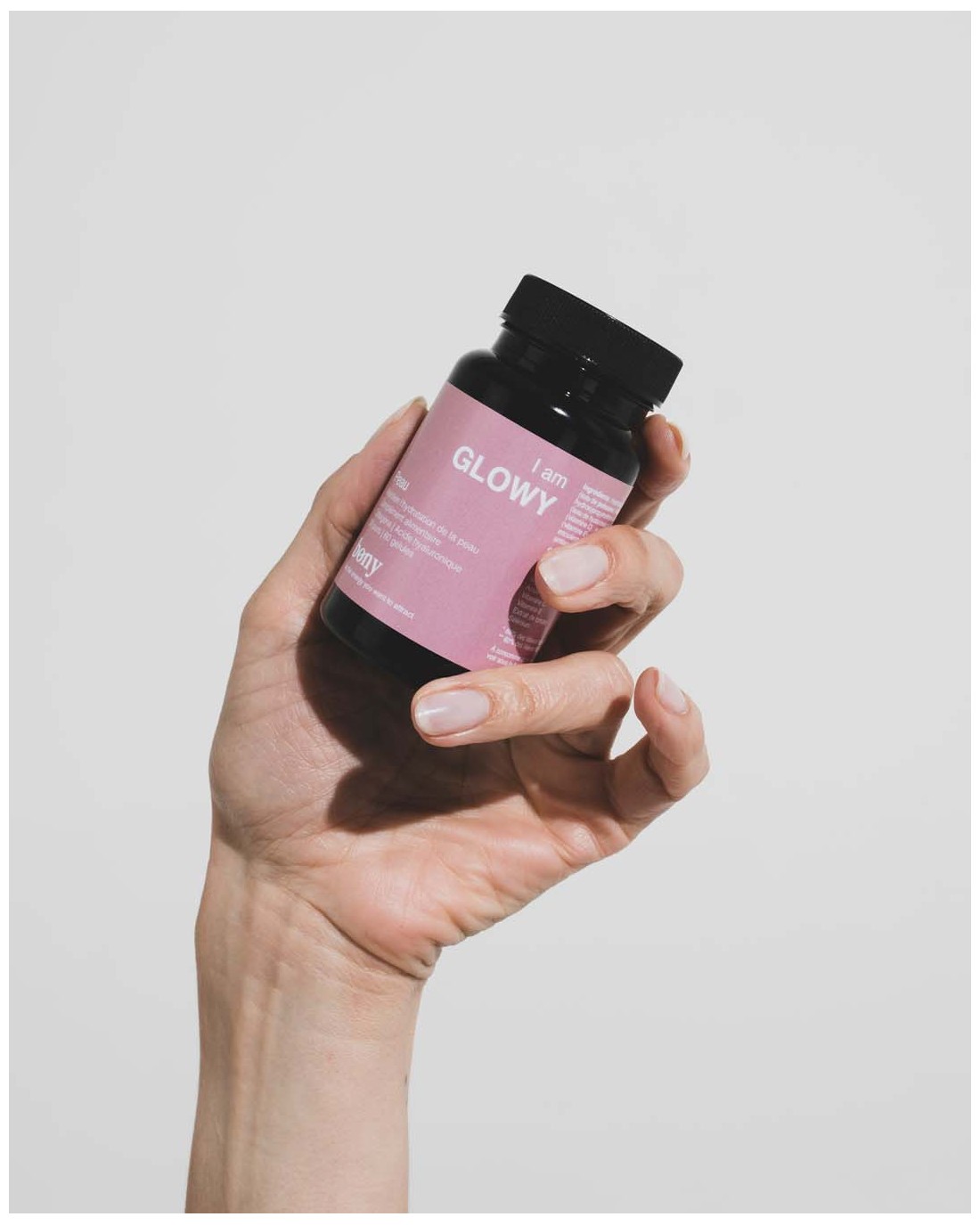 Marine collagen hydrolyzate (from fish); plant-based capsule: hydroxypropylmethylcellulose; hyaluronic acid (from sodium hyaluronate); vitamin C; maltodextrin; anti-caking agent: magnesium salts of fatty acids; plant-based vitamin E; plant-based lycopene; selenium-enriched yeast.