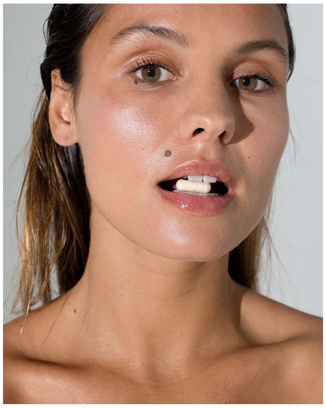 Dietary supplement based on marine collagen hydrolyzate, hyaluronic acid, vitamins, and selenium. It improves the skin's beauty, hydrates, and firms it.